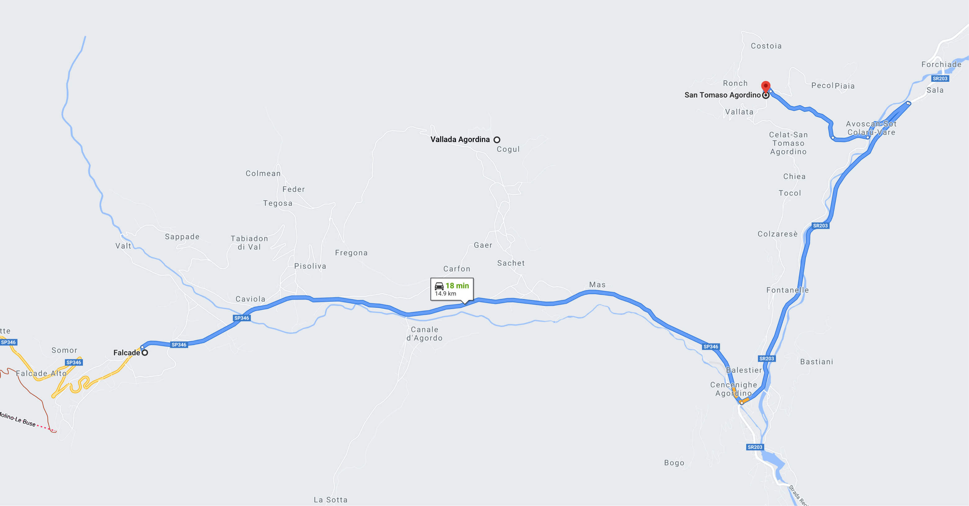 From the A22 /E45 Brennero Modena motorway, drive to the Val d’Ega/Eggental exit and take the SS241 into the Val di Fassa, and follow the signs for the SS48 Moena. You will be met by splendid views on the way both up and down the San Pellegrino Pass, which will take you into the Unesco Dolomites of Falcade and your Biois Valley, your destination.