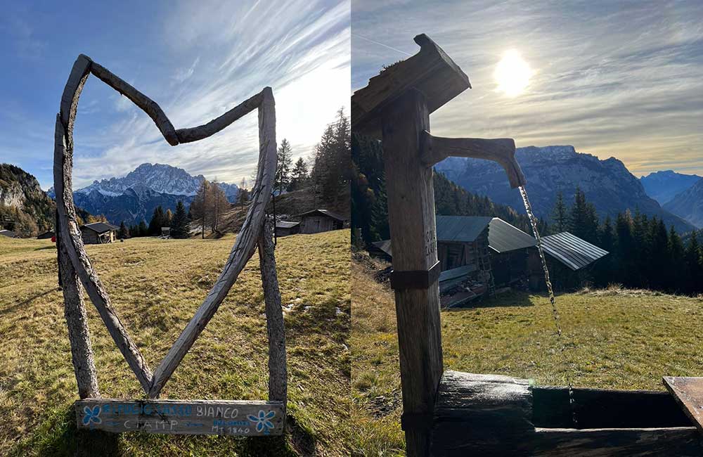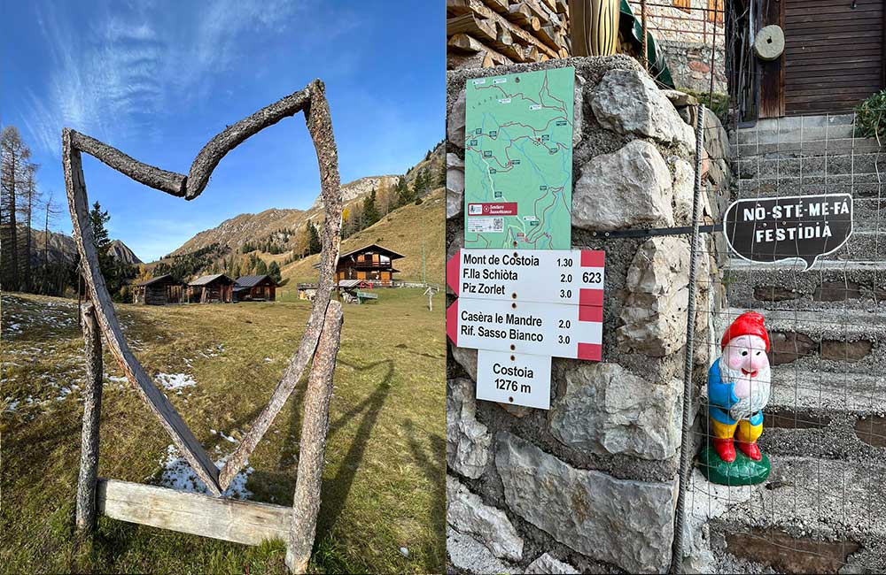 Da forcella San Tomaso si scende verso Celat lungo il percorso delle Dolomiti in miniatura, l’unico posto in cui ammirare tutti insieme i sistemi montuosi che compongono le Dolomiti Unesco attraverso delle sculture in Dolomia disseminate lungo il percorso.