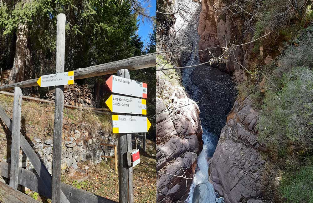 Si prosegue fino al villaggio di Somor e si imbocca il paesaggistico sentiero delle Coste che collega i paesi alti della Valle. Alla fine del sentiero, attraversando il ponte sul torrente Gavon si arriva nei borghi di Canes/Marmolada/Sappade.