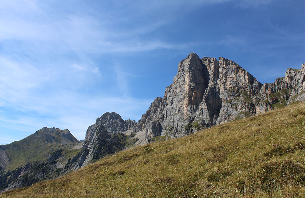 Ora si continua per un sentiero che attraversa i pascoli d’alta quota sotto le torri dell’Auta (2624 m) per raggiunge la Baita di Còl Mónt (1854 m).