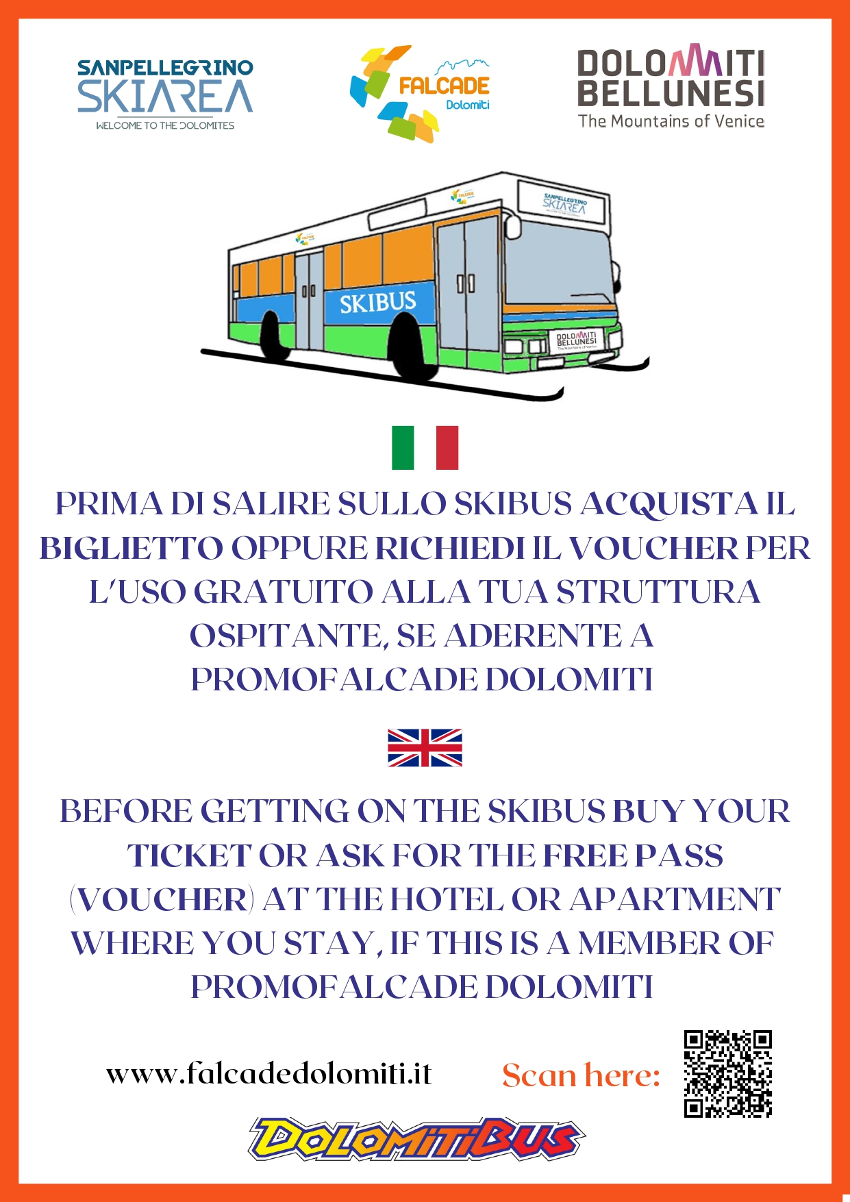 - costo biglietto stagionale € 50.00 acquistabile solo nella biglietteria Dolomiti Bus di Agordo e nell’ufficio turistico di Alleghe nel caso ci fosse la necessità di emettere la smart card Unica Veneto con foto allegata.