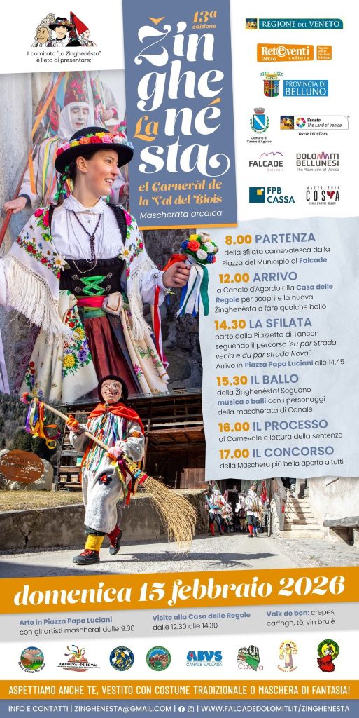 Davanti alla Casa delle Regole di Canale D’Agordo avverrà la rivelazione della Zinghenesta, che sfilerà per le vie del paese e danzerà con le sue amiche maschere dei Matiéi con il loro caratteristico cappello a cono da cui scendono delle strisce filanti e colorate ed i Lachè, simpatici e buffi personaggi intrattenitori con le maschere lignee.