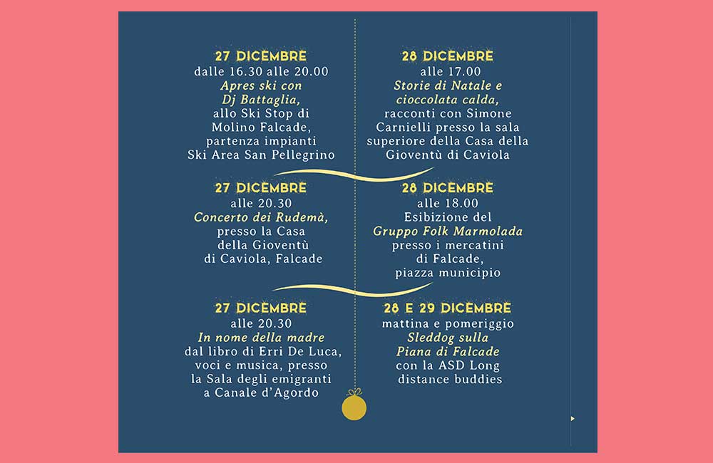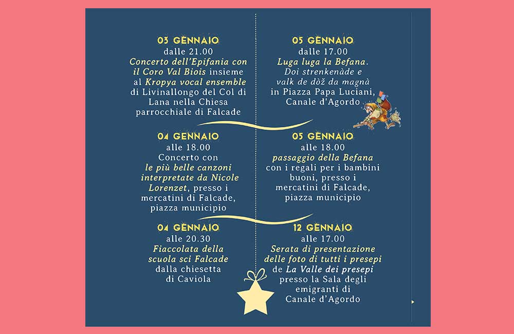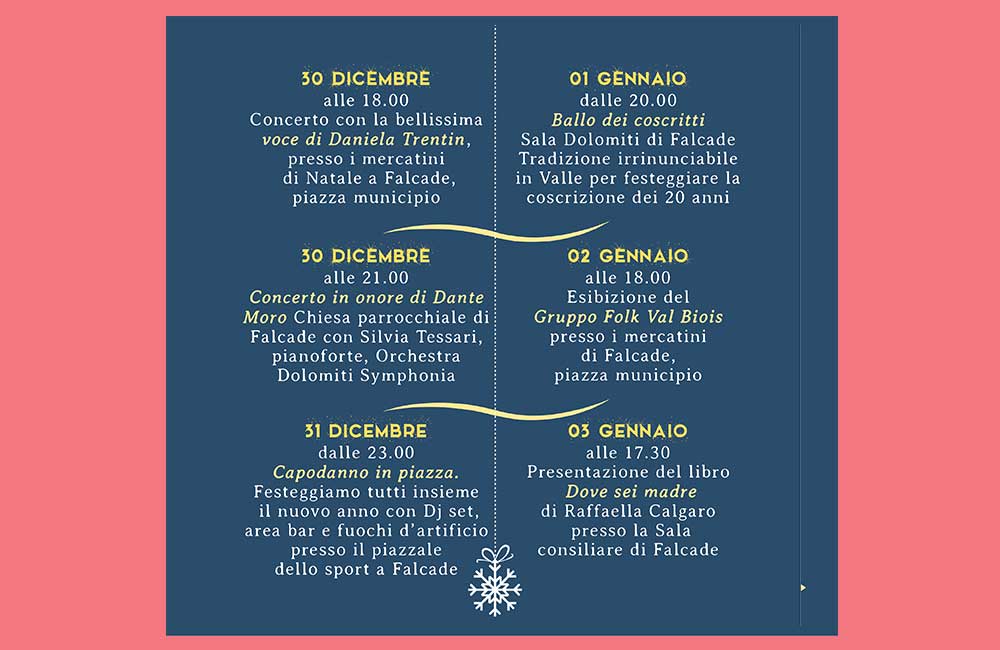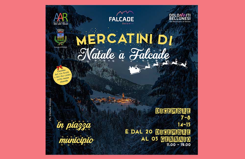 L’arrivo delle festività natalizie, come un tocco magico della bacchetta di una fata, trasformano la piana di Falcade e l’intera Val del Biois in una valle incantata coperta dal soffice manto bianco della neve ed illuminata da calde luci che compaiono dalle terrazze delle case e dalle vie rendendo l’atmosfera ancora più fiabesca.