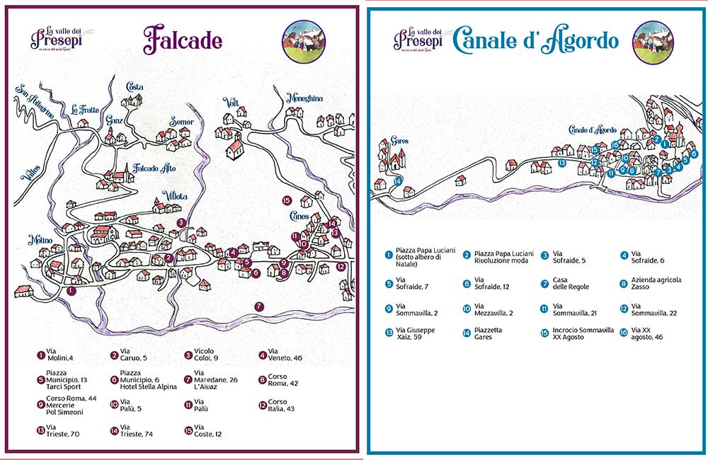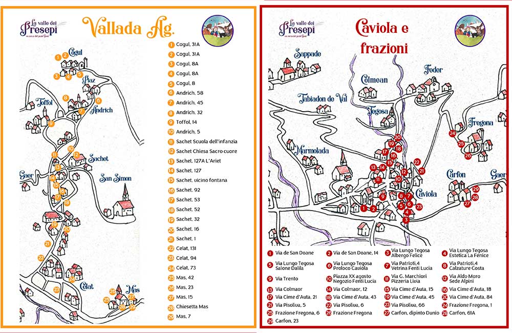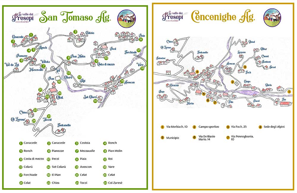 Una mappa che potrà essere ritirata presso presso gli uffici turistici della vallata, vi indicherà il cammino ed i luoghi dove ammirare i presepi e vi guiderà in questo percorso diffuso dedicato alla Natività, accompagnando i visitatori alla scoperta di presepi artistici, tradizionali e creativi realizzati dagli abitanti del luogo.