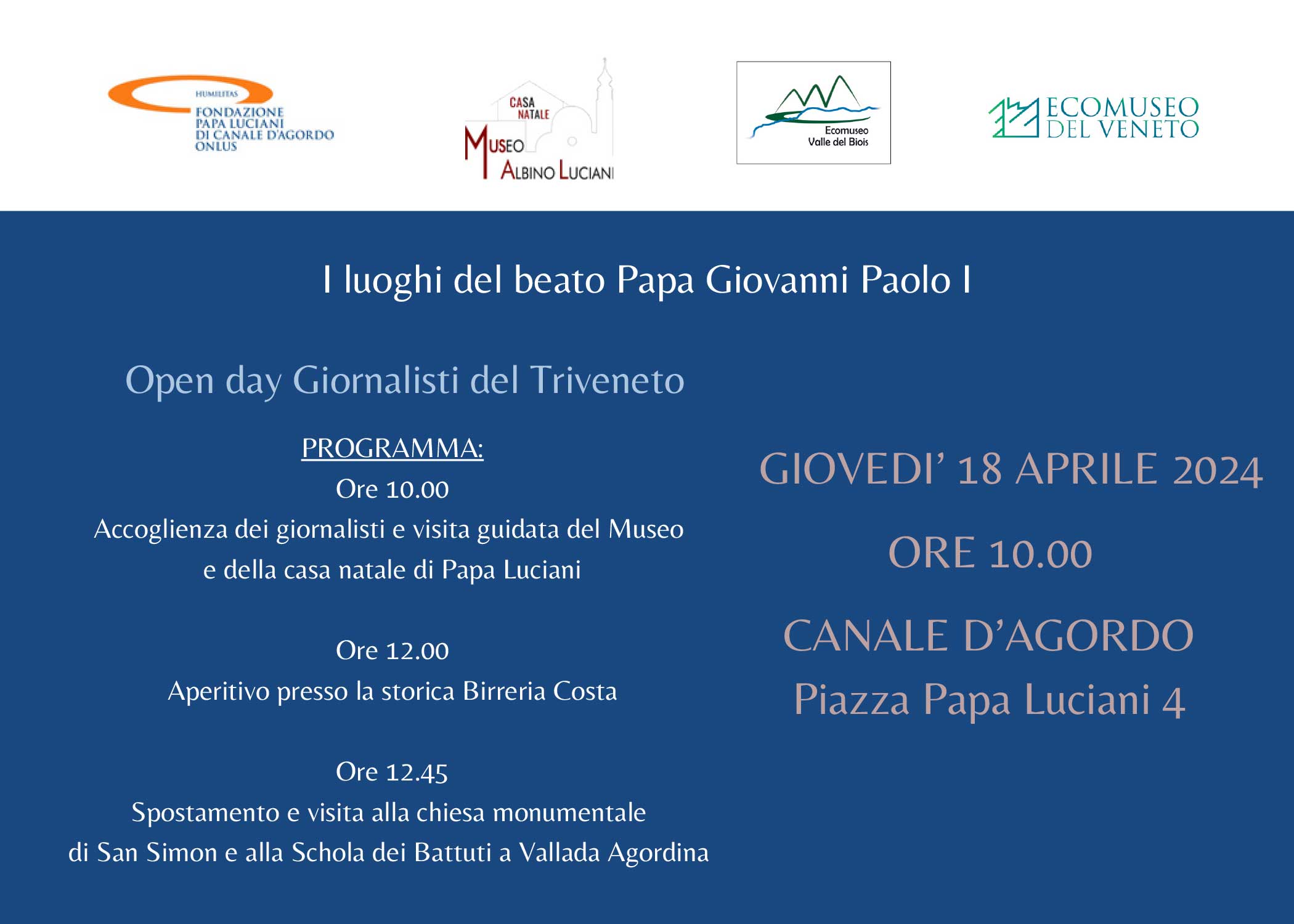 Visite guidate e momenti conviviali permetteranno ai professionisti del settore del turismo e dell’informazione di conoscere meglio non solo il Museo e la Casa natale di Papa Luciani, ma anche la chiesa di San Simon (monumento nazionale) e la Schola dei Battuti a Vallada Agordina. - Dal 22 al 28 aprile si terrà il primo meeting degli Ecomusei del Veneto.