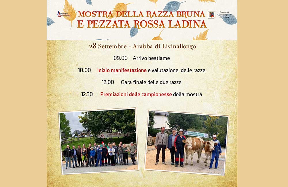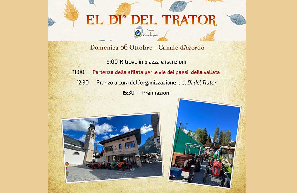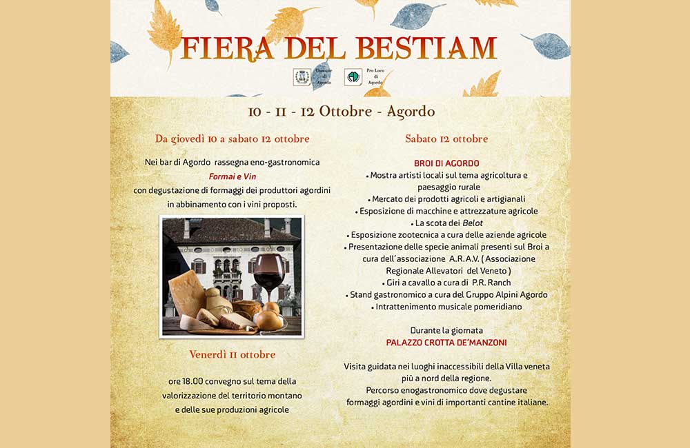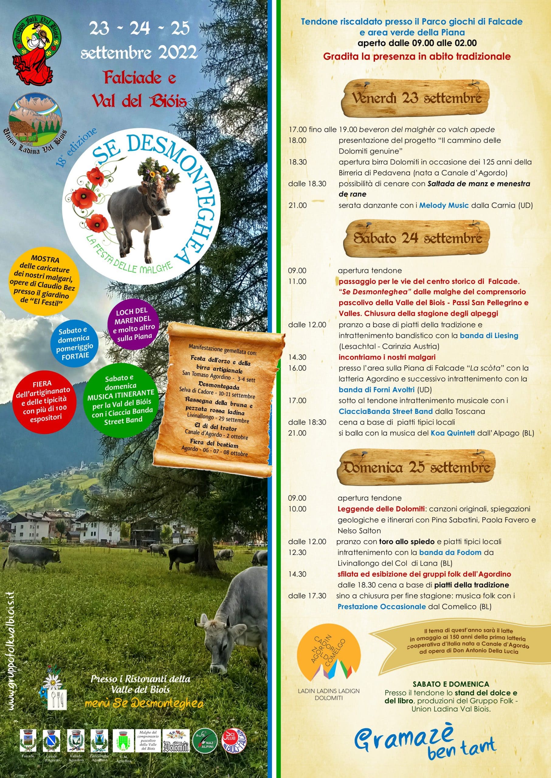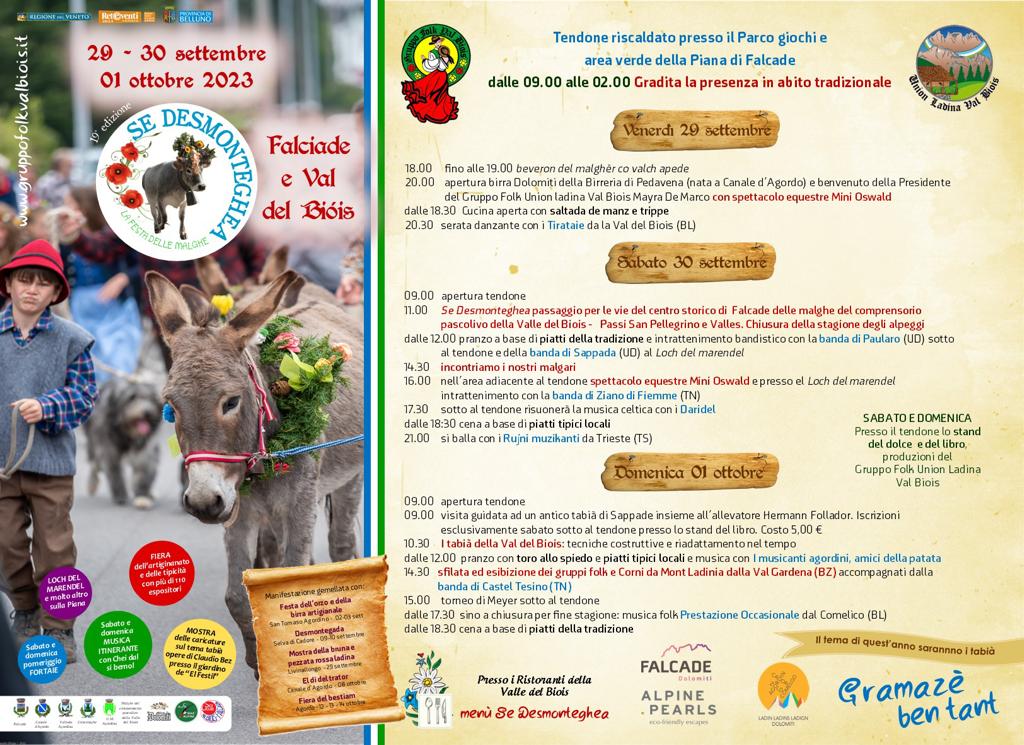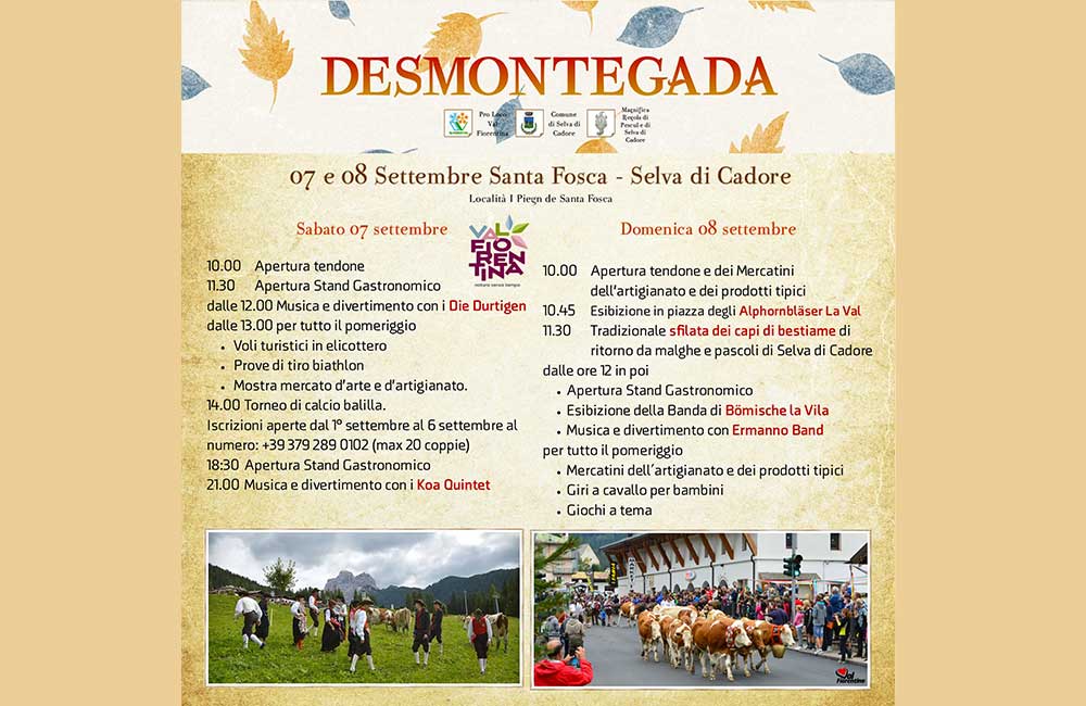 Questo divertente e storico evento che racconta le tradizioni dolomitiche, vede come palcoscenico le vie del centro di Falcade che applaudiranno la sfilata degli animali di ritorno dai pascoli estivi; all’interno dell’immancabile tendone delle eccellenze del territorio agordino, non mancheranno le proposte di piatti della tradizione, gli approfondimenti sulla cultura alpina, la sfilata dei gruppi folk agordini e tanta buona musica.