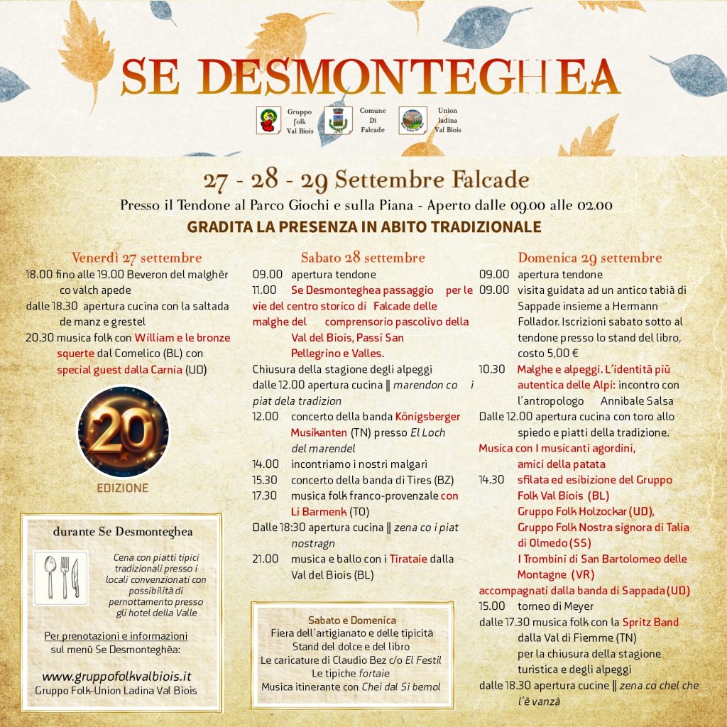 L’evento Se Desmonteghea, è un’allegra e colorata festa che coinvolge tutto il paese di Falcade e dintorni, per celebrare la festosa discesa delle mandrie dai pascoli.