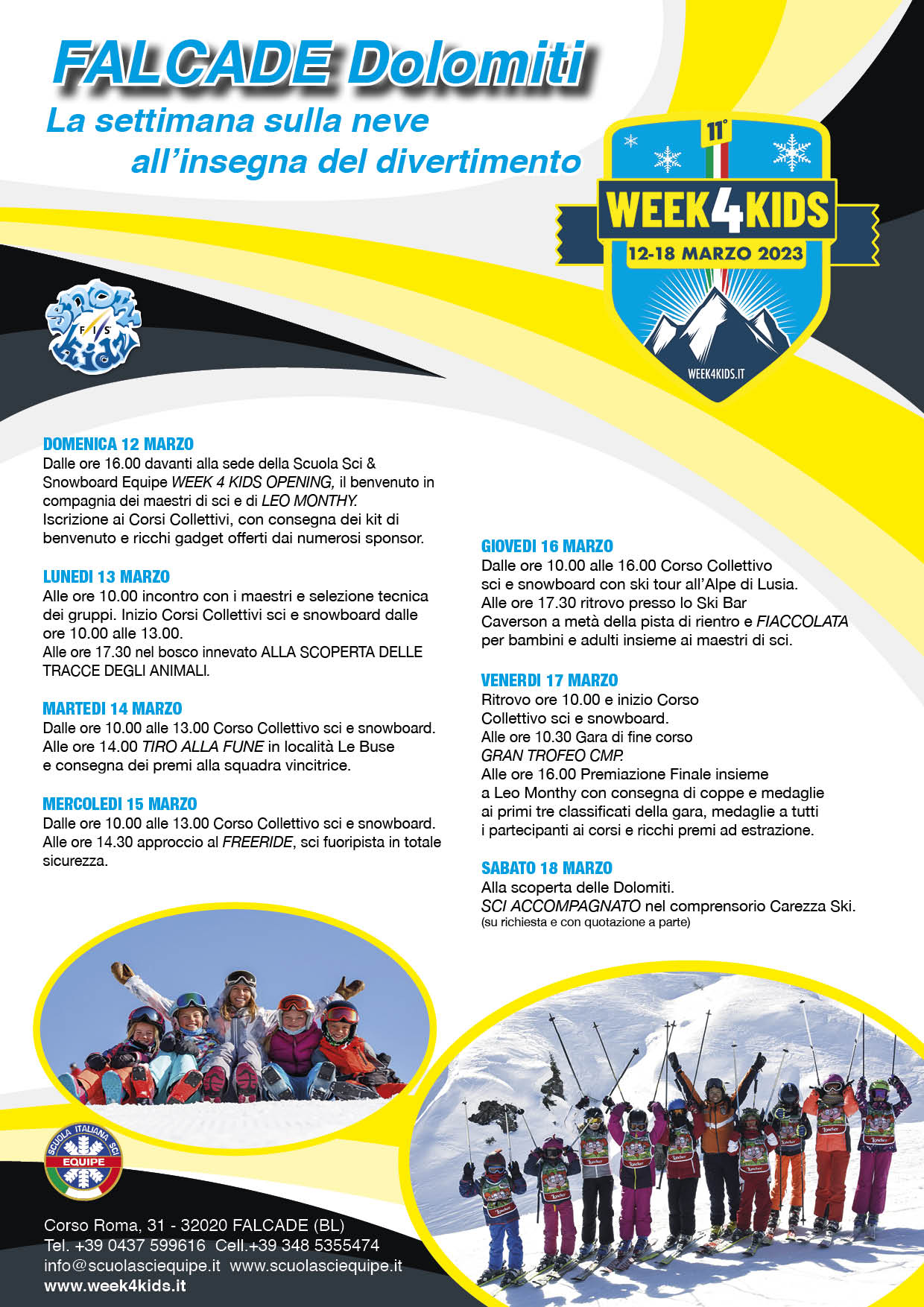 Week for Kids è un format pensato appositamente per bambini e ragazzi che durante la settimana potranno dedicarsi allo sci durante la mattinata, ma anche a tanti giochi e attività sulla neve nel pomeriggio, seguiti e guidati costantemente dall’occhio attento e vigile dei maestri della Scuola Sci & Snowboard Equipe di Falcade.